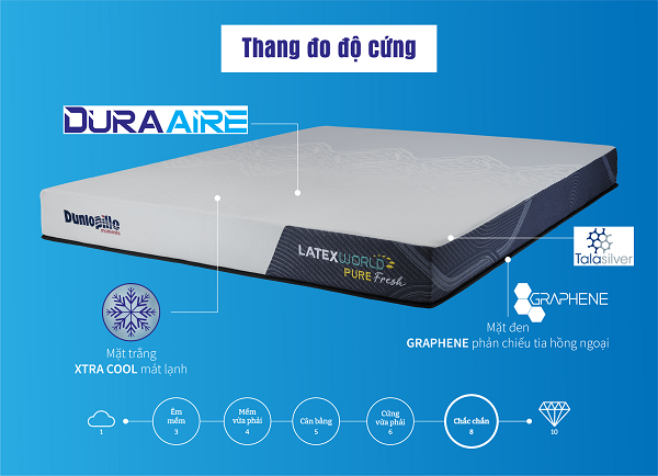 Đệm cao su Dunlopillo Latex World Pure Fresh đạt độ cứng 8/10 trên thang đo từ 1 - 10 (1: Rất mềm - 10: Rất cứng). Chính vì thế khi nằm, người dùng sẽ cảm thấy thoải mái và được nâng lên nhẹ thay vì chìm hẳn xuống như nhiều dòng đệm cao su khác.
